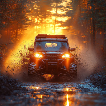 An off road vehicle charges through muddy trails surrounded by glowing sunset skies.