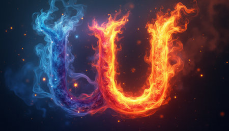 The image showcases a striking letter U crafted from swirling flames, blending vibrant blue and fiery orange hues. This captivating design symbolizes energy and creativity, evoking a sense of passion and dynamism through its fiery elements.