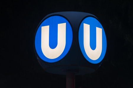 Vienna, Austria - August 30, 2020: Vienna U-Bahn logo of underground rail transit system at night.