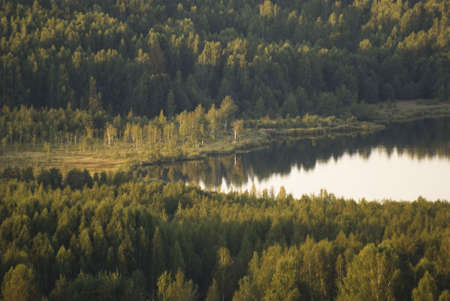 Lake in Karelia among larch trees, Russia. Beautiful autumn season landscape with river and forest stock photo