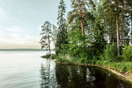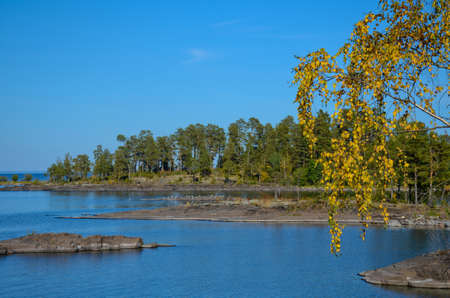 The clear blue water of a bay or lake. Rocky islands with trees in the water. Green tall pines and wishing birch branch. Clear, sunny day, blue clear sky.