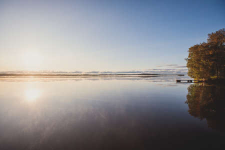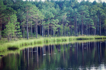 Crystal clear lake (bog) at sunrise. Pine trees, plants, heather flowers. Clear blue sky, symmetry reflections on water. Autumn. Kemeri national park, Latvia. Pure nature, ecotourism, hiking