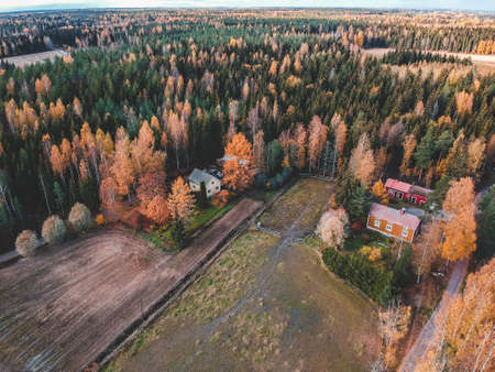 Aerial view of autumn forest with country houses and gardens. Photo taken from a drone. Finland, Pornainen.