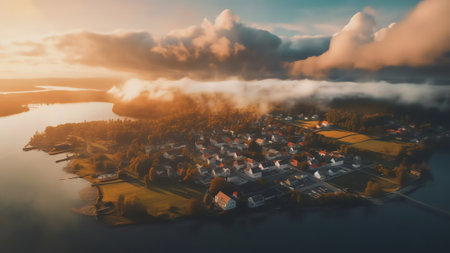 Generative AI : Aerial view of houses along the Loire river with sandbanks at sunset with low clouds and fog in Gennes MaineetLoire France