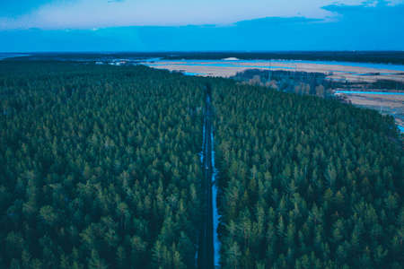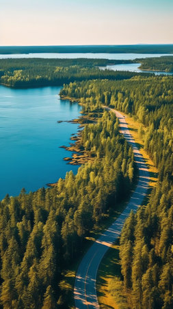Generative AI : Aerial view of small gravel road countryside lake and colourful forest in Vorumaa Estonia