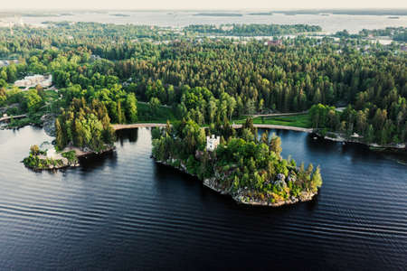 Aerial landscape view of Monrepo park in Vyborg city. Summer, green forest, island, castle, blue sky . High quality photo