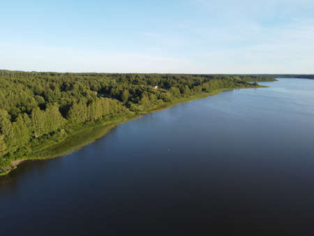 Aerial view of scenic Rubikiai lake, located near Anyksciai town, Lithuania. Beautiful landscape view from the above on summer sunset.