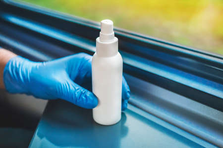 A hand in a blue latex glove holds a disinfectant. The concept of preventive protection against coronavirus. Use of antiseptics for cleaning.