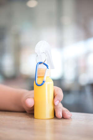 Yellow bottle spraying alcohol for cleaning hand in baby's hand. Hand applying alcohol spray or anti bacteria spray to prevent spread of germs, bacteria and virus.