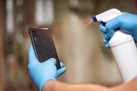 Man's hands cleaning smartphone, spraying antibacterial sanitizing, prevent infection of coronavirus (Covid-19) virus.