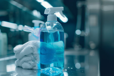 A modern clear spray bottle filled with a cleaning solution rests against a soft color background, perfect for illustrating home care, hygiene, and cleanliness.