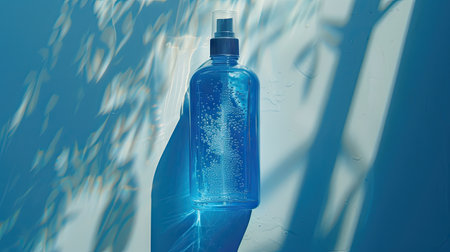 A blue antiseptic with a spray of sperm solution is located in human hands on a white matte background.