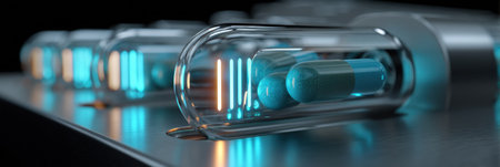 A futuristic machine produces glowing capsules in a modern laboratory, showcasing advanced medical technology in a sleek metal environment.