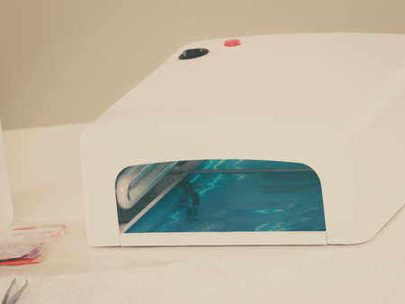 Manicure set, professional uv led lamp with blue light for drying gel hybrid nail polish. Beauty wellness spa treatment objects concept