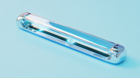 A sleek chrome stapler rests on a soft blue surface, showcasing modern design and functionality. Ideal for enhancing workspace aesthetics and productivity.