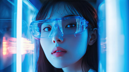 A woman wearing futuristic glasses is surrounded by blue light, creating a high-tech atmosphere.