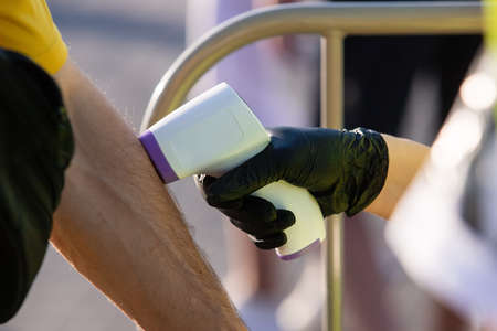 inspector with a non-contact infrared thermometer in a public place checks the temperature. Checking body temperature before entering a public place to fight coronavirus
