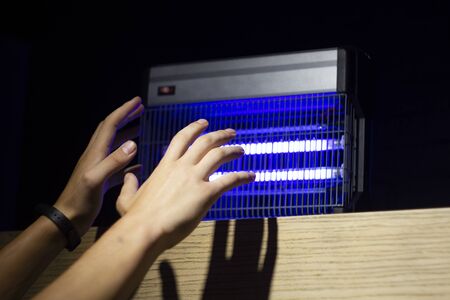 An electric mosquito swatter, or zapper racket, is turned on, glowing with a bright blue UV light in a dark room. The red indicator light is also on, showing the device is active and ready to kill insects.