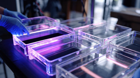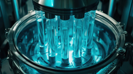 A high-tech laboratory scene showcasing transparent test tubes illuminated by soft blue light, emphasizing advanced scientific experimentation and research equipment for innovative processes.