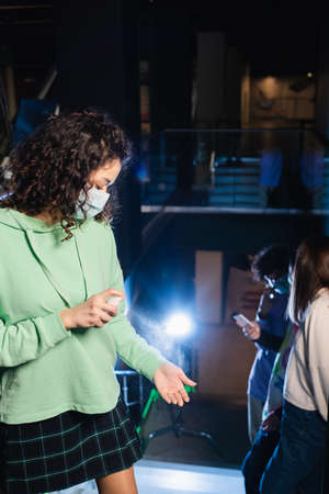 african american girl in medical mask applying hand sanitizer near blurred friends