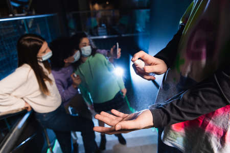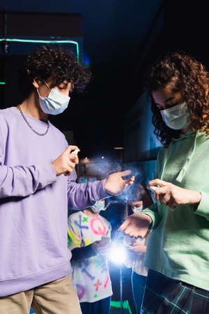 multiethnic teenagers in medical masks applying hand sanitizer in game club