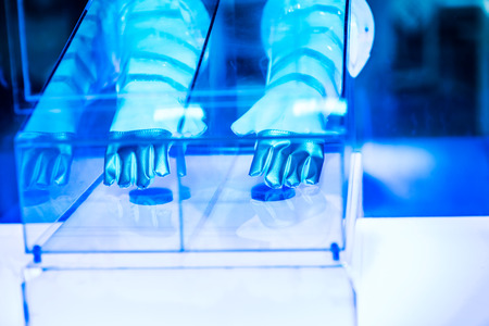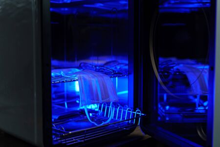 UV light sterilization of face mask to disinfection. COVID-19 prevention concept. ultra-violet sterilization and disinfection.