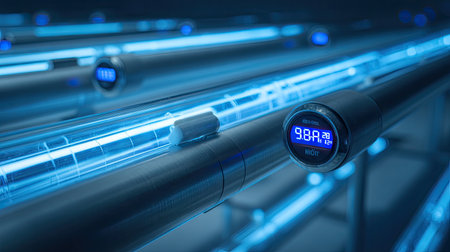 A captivating image showcasing a modern industrial setting featuring transparent tubes illuminated by a blue light, with a digital temperature gauge clearly displaying values.