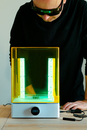 Man wearing glasses adjusting a wash and cure machine using UV light before use, for 3d resin printer