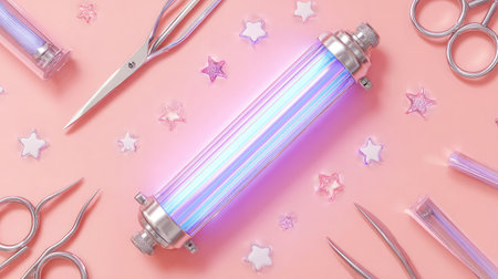 Open UV gel lamp glowing on a soft pink backdrop with tiny nail accessories placed around