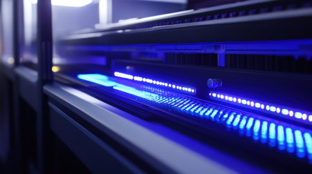 A detailed view of a high-tech machine illuminated by blue LED lights, showcasing modern engineering and functionality in a sleek digital environment.