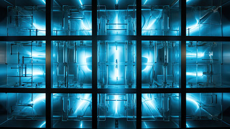 Futuristic blue neon lights in symmetrical mechanical pattern