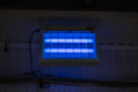 Ultraviolet lamp in the production hall of food products. Image out of focus. The concept of cleanliness and hygiene