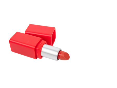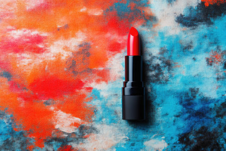 Close-up of a vibrant red lipstick on a sleek surface with a blurred background, offering ample space for text.