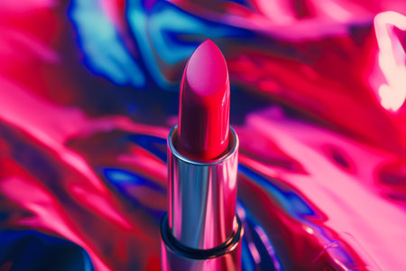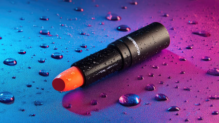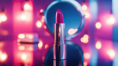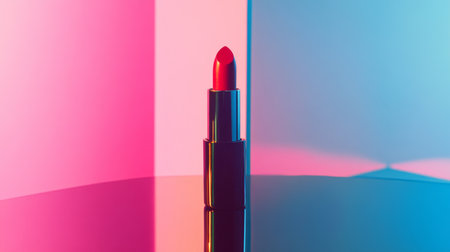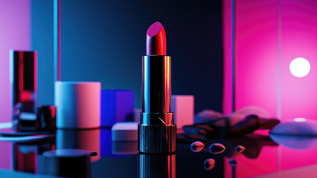 A striking red lipstick stands tall on a glossy surface, illuminated by vivid neon lights, creating a dramatic and modern beauty aesthetic perfect for cosmetic promotions.