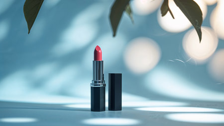 Close-up of a lipstick in a high-fashion setting with a blurred background for ample copy space.