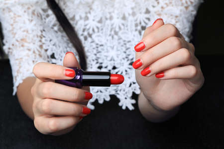 Beautiful fashionable beauty cosmetic glamorous red lipstick for applying makeup on the lips on a yellow gentle background.