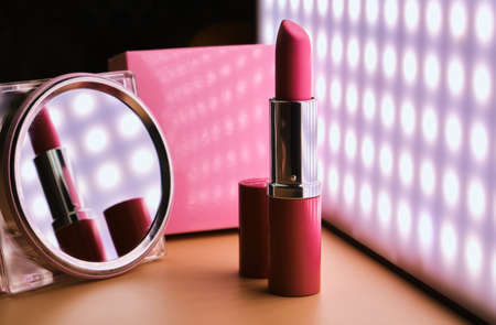 Creative photo of open lipstick in the dark, against the background of led light, with reflection in a round mirror. Blog concept about beauty, makeup and glamor.