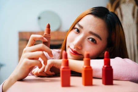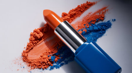 A dynamic image of a lipstick tube with its cap off, revealing a bold color, with a background of scattered makeup products and a stylish vanity setting.