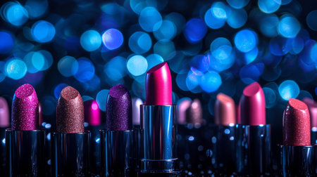 A stunning array of lipsticks rests against a backdrop of colorful bokeh lights, highlighting various shades and textures. The glamorous display entices beauty enthusiasts and makeup lovers alike.