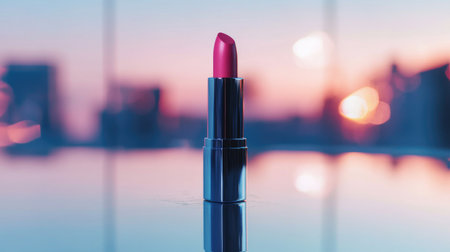 A dramatic shot of a single lipstick tube standing upright on a mirrored surface, reflecting its bold color, surrounded by soft, ambient lighting
