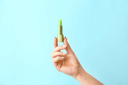 Beautiful bright classic blue lipstick and yellow complementary color on the background