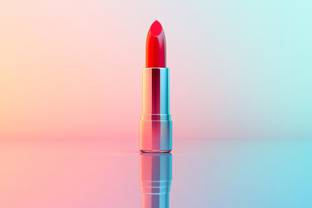 Red lipstick nestled in a metallic case, reflecting beautifully against a gradient background of pink and turquoise hues