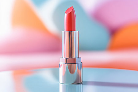 Red lipstick in silver tube standing on colorful reflective surface with pastel background