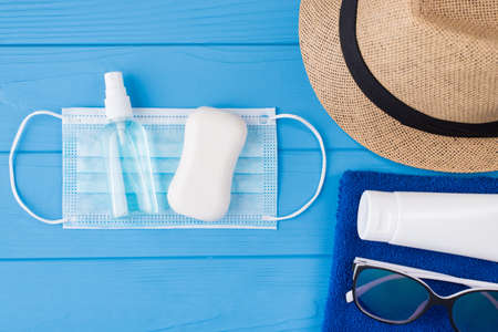 Quarantined summertime concept. Top above overhead view close-up photo of towel sunglasses sunscreen mask sanitizer sopa and sunhat isolated on blue wooden background with copyspace