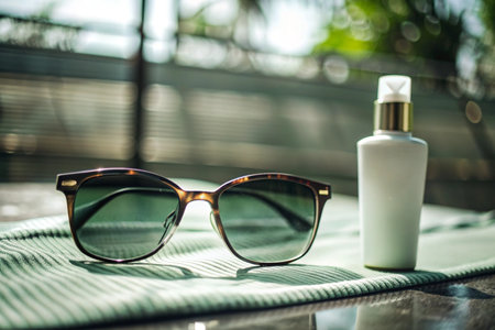 A vibrant sunscreen tube rests on a wooden surface, accompanied by trendy sunglasses and a soft towel, evoking summer vibes and skincare essentials.