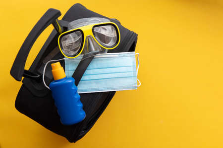 Covid travel. Luggage packed with a face mask sun cream and scuba mask