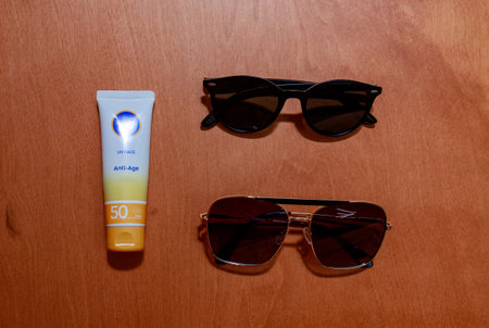 Protective face cream with SPF 50 placed beside black and gold sunglasses, neatly laid out on warm wood texture in daylight.