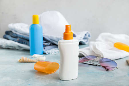 Travel accessories with sunscreen cream on light background