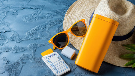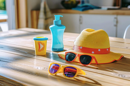 Summer beach essentials displayed on a wooden table with natural light Yellow hat, colorful sunscreen, and playful sunglasses create a vibrant scene