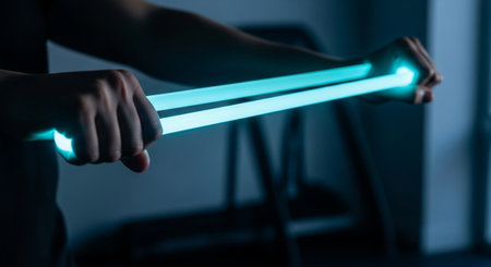 Unique Industrial Device Featuring Illuminated Blue Tube In Dark Environment Highlighting Innovative Technology and Engineering Concepts in Machinery